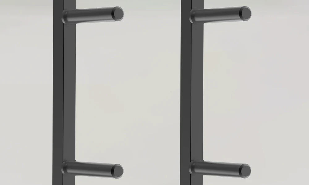 The machine frame is equipped with 6 bumper plate storage pins on the back that can accommodate both 25mm and 50mm weight plates, offering a substantial weight storage capacity of 455kg to keep your training area tidy.