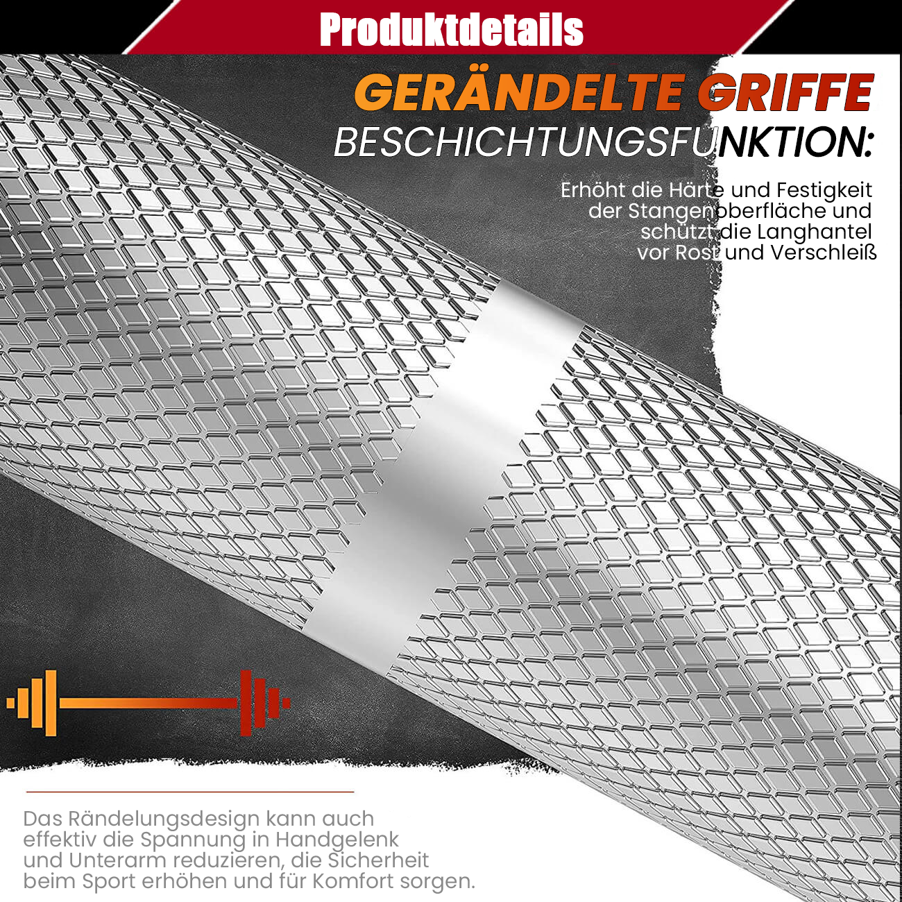Erreichen Sie Ihre Fitnessziele mit einer vielseitigen 7 ft langen Olympia-Langhantel. Die Powerlifting-Stange eignet sich hervorragend für Kniebeugen, Bankdrücken, Kreuzheben und andere Powerlifting-Übungen.