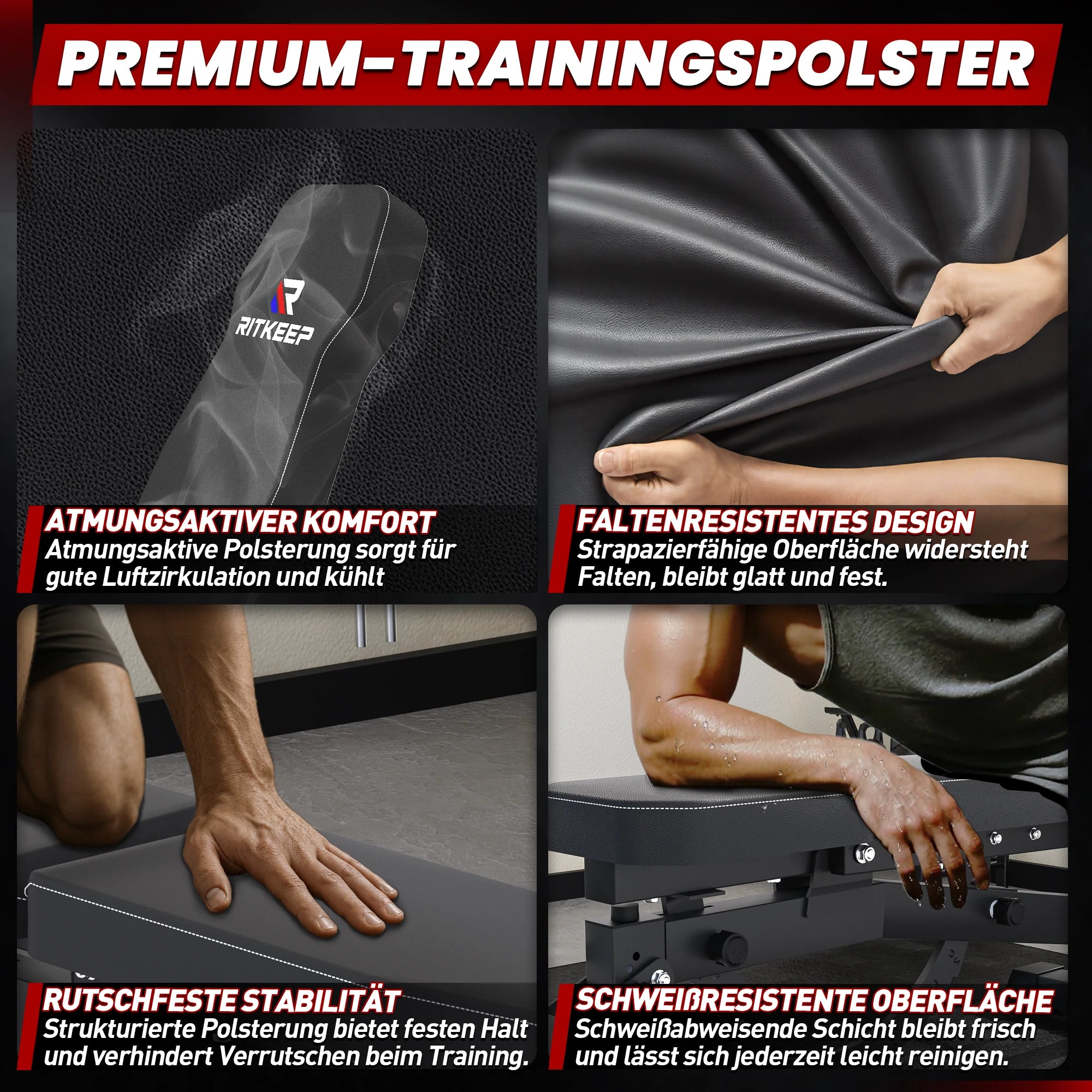 Unlike other models, the RitKeep folding workout bench is constructed from high-quality square steel, which is 1.5 times thicker than standard steel tubing and can support over 544 kg. It offers exceptional stability and durability for any strength training session. The seat is made of non-slip, high-tech synthetic leather with 5-layer padding for comfort, support, and safe training. Furthermore, the compact bench folds up to save space and can be easily stored. Assembly is quick and easy thanks to the included instructions – ideal for any home gym.