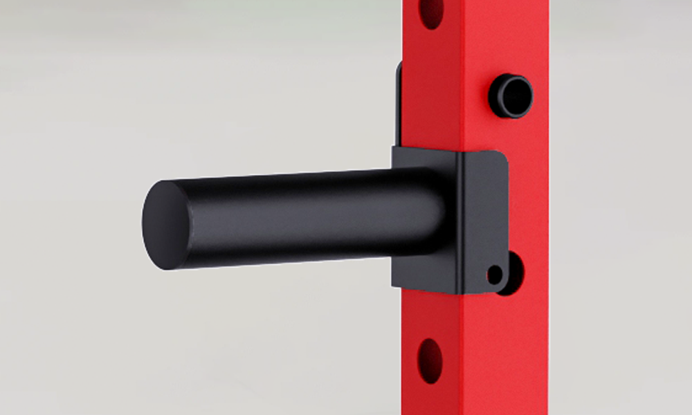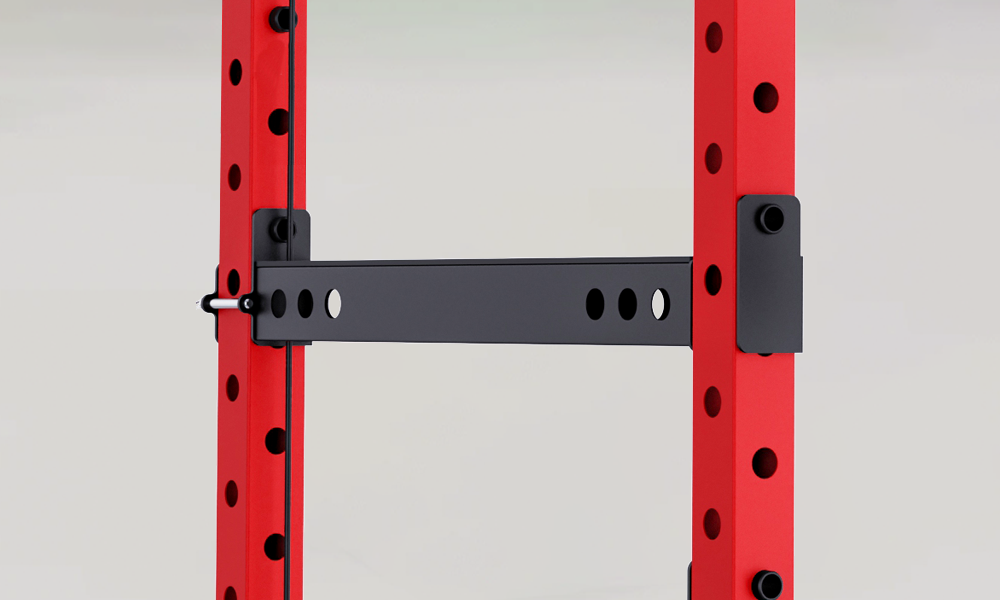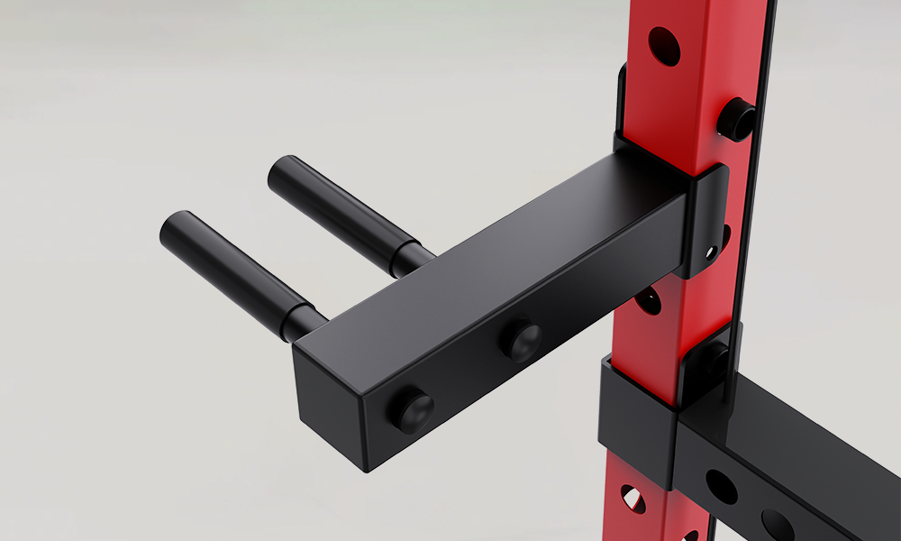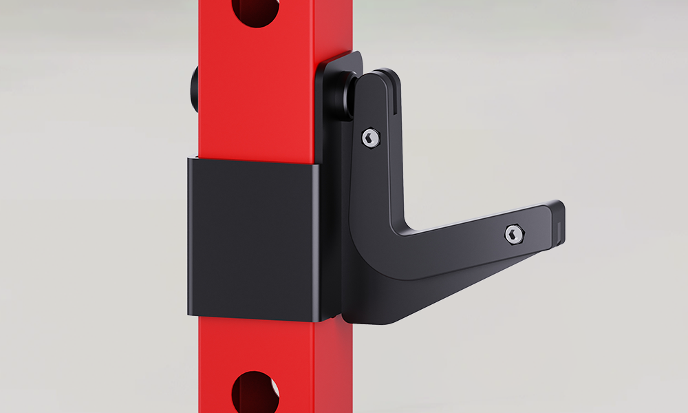 - J-Hooks mit verstellbarer Höhe und Schutzbeschichtung zum Schutz der Langhantel.